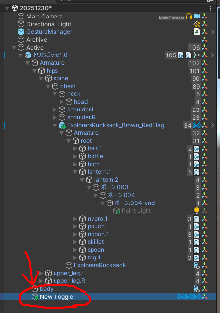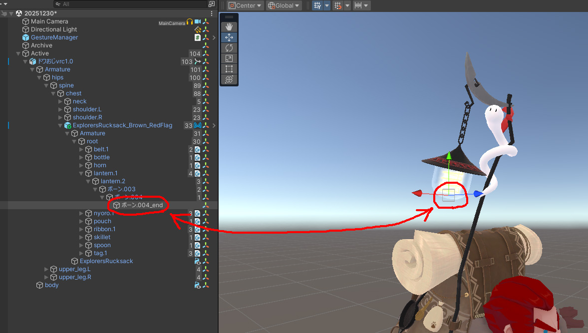 下図アバターの右側にあるランタンにライトを仕込んでいきます。
