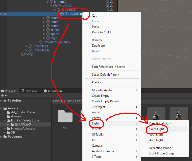 光源を仕込みたい対象を右クリックし [Light > Point Light] を選択して明かりを作成します。