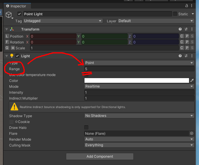 ヒエラルキーから追加した Point Light を選択し、インスペクターの Range の数値を小さくします。
