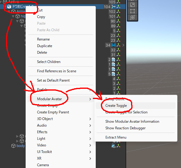 アバター内の任意の位置(今回は直下)を右クリックし [Modular Avatar > Create Toggle] を選択します。