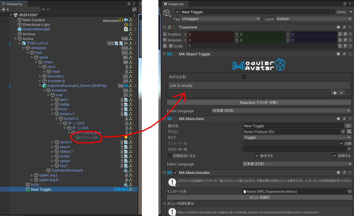 New Toggle をクリックしてインスペクターに内容を反映させたら「List is empty」の中へ Point Light をドラッグ&ドロップします
