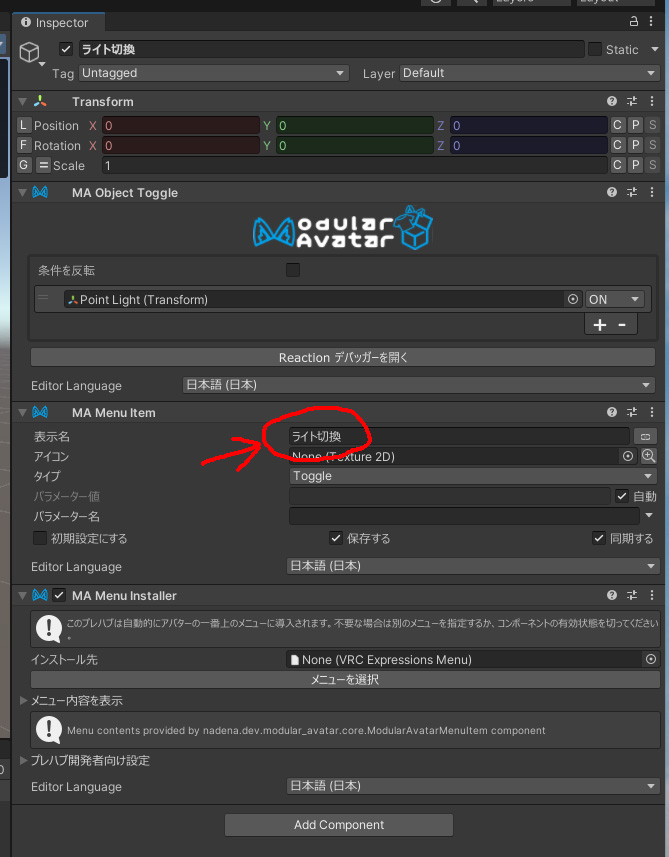 表示名は分かりやすいものに変更しておくことをお勧めします(変更するとヒエラルキー側のオブジェクトの名前も自動で書き換わります)。