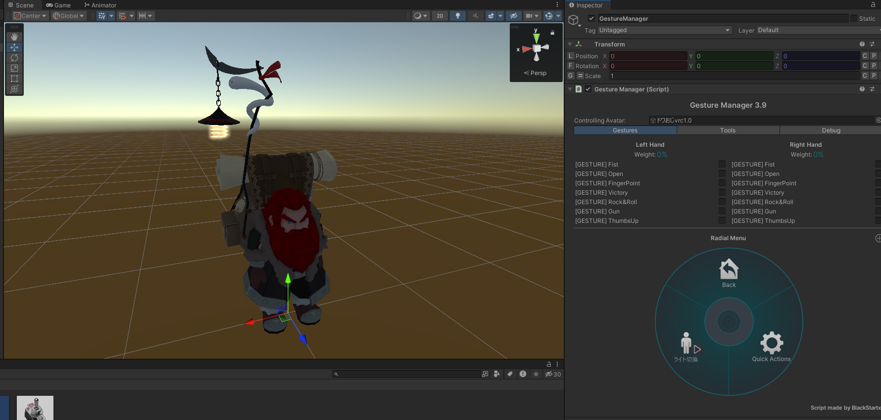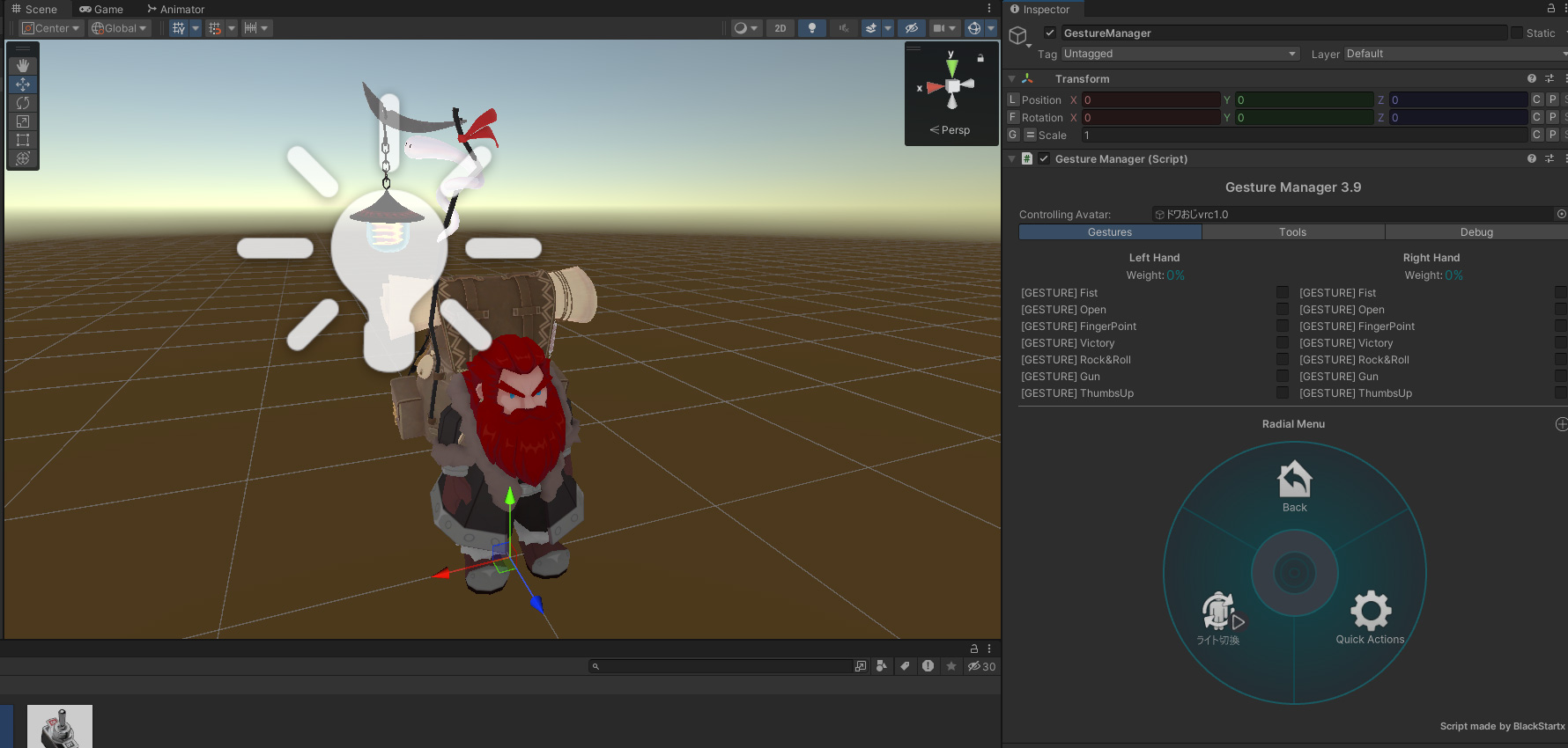 Gesuture Managaer があるならば VRChat にアップロードしなくても動作確認ができます。一旦 Directional Light を非表示にして Gesture Manager から Play-Mode に入ります